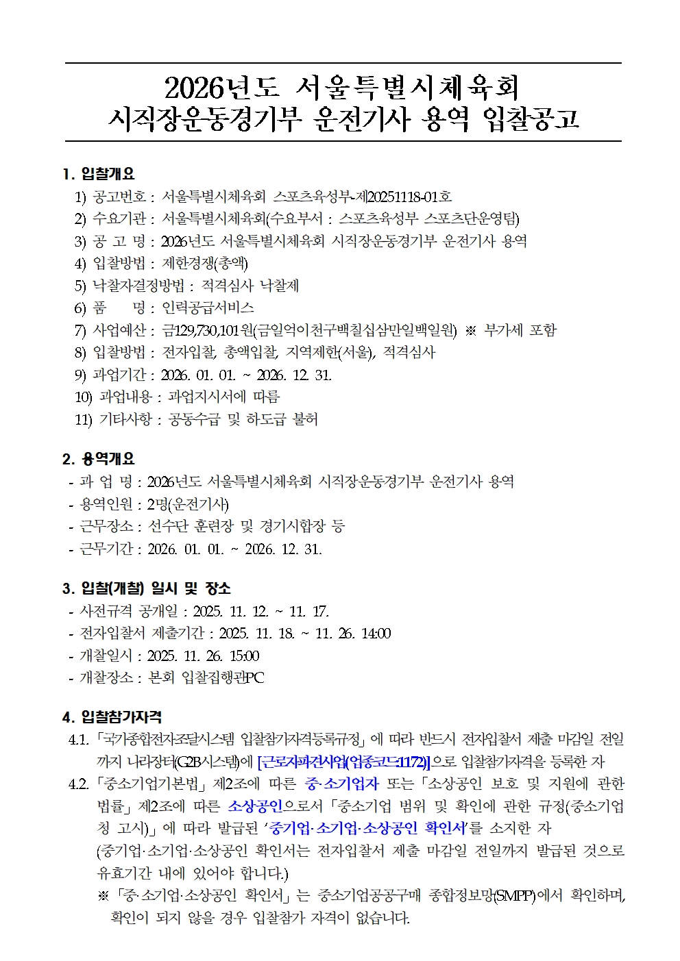 [입찰공고] 2026년도 서울특별시체육회 시직장운동경기부 운전기사 용역