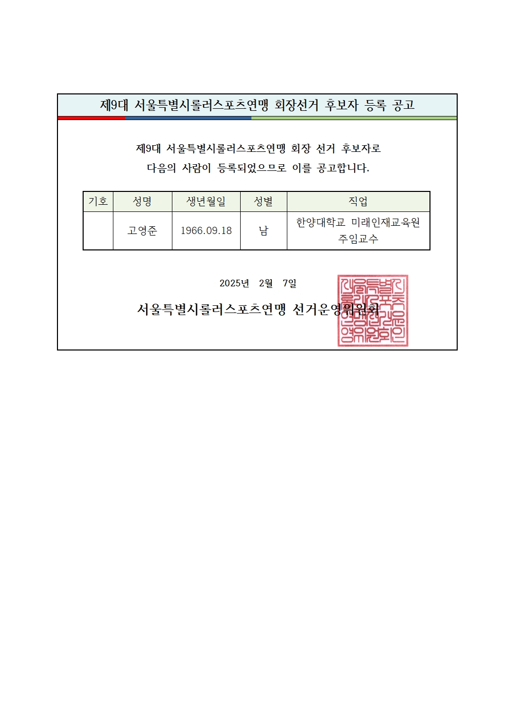 제9대 서울특별시롤러스포츠연맹 회장선거 후보자 등록 공고