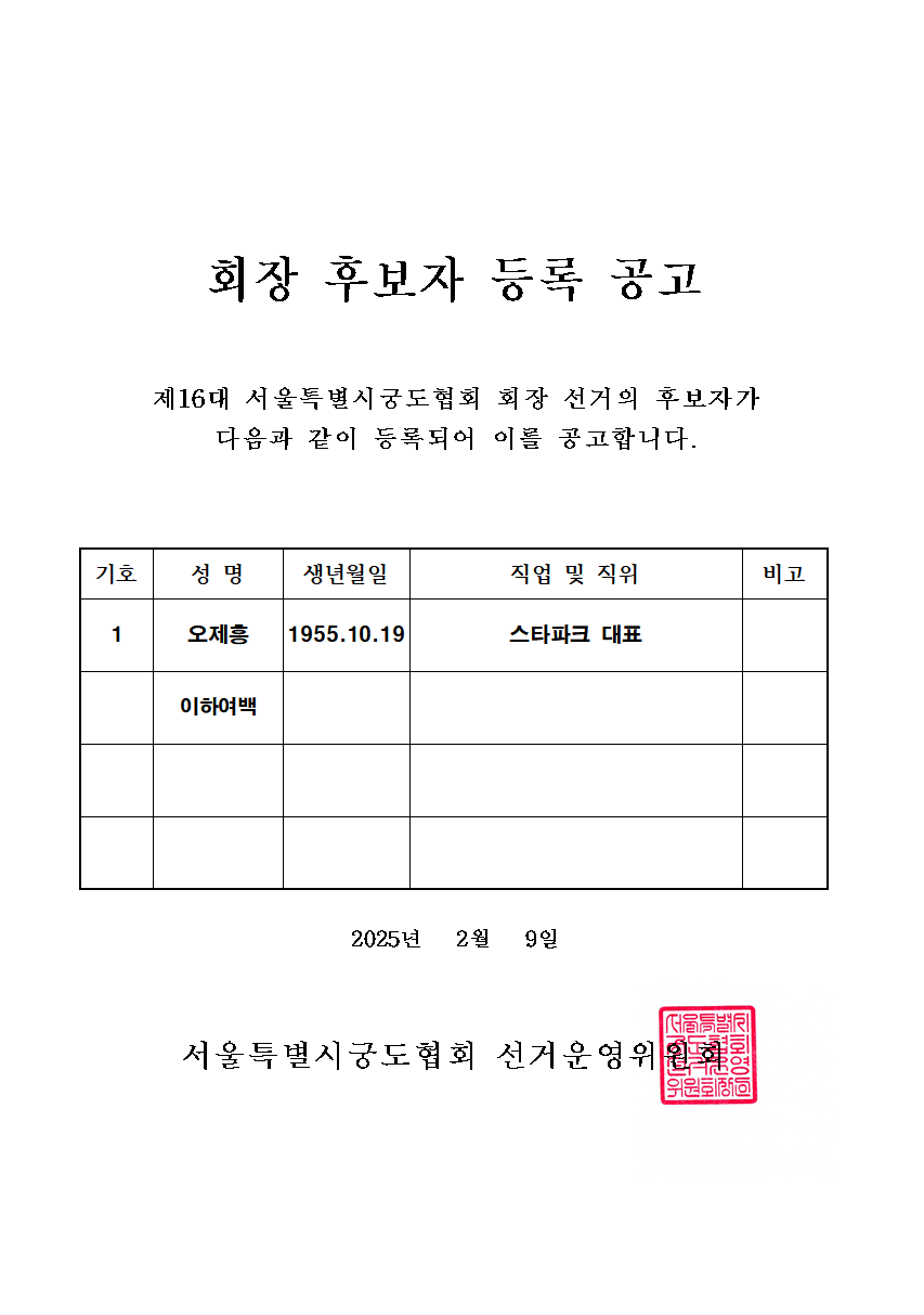 제16대 서울특별시궁도협회 회장 후보자 등록 공고
