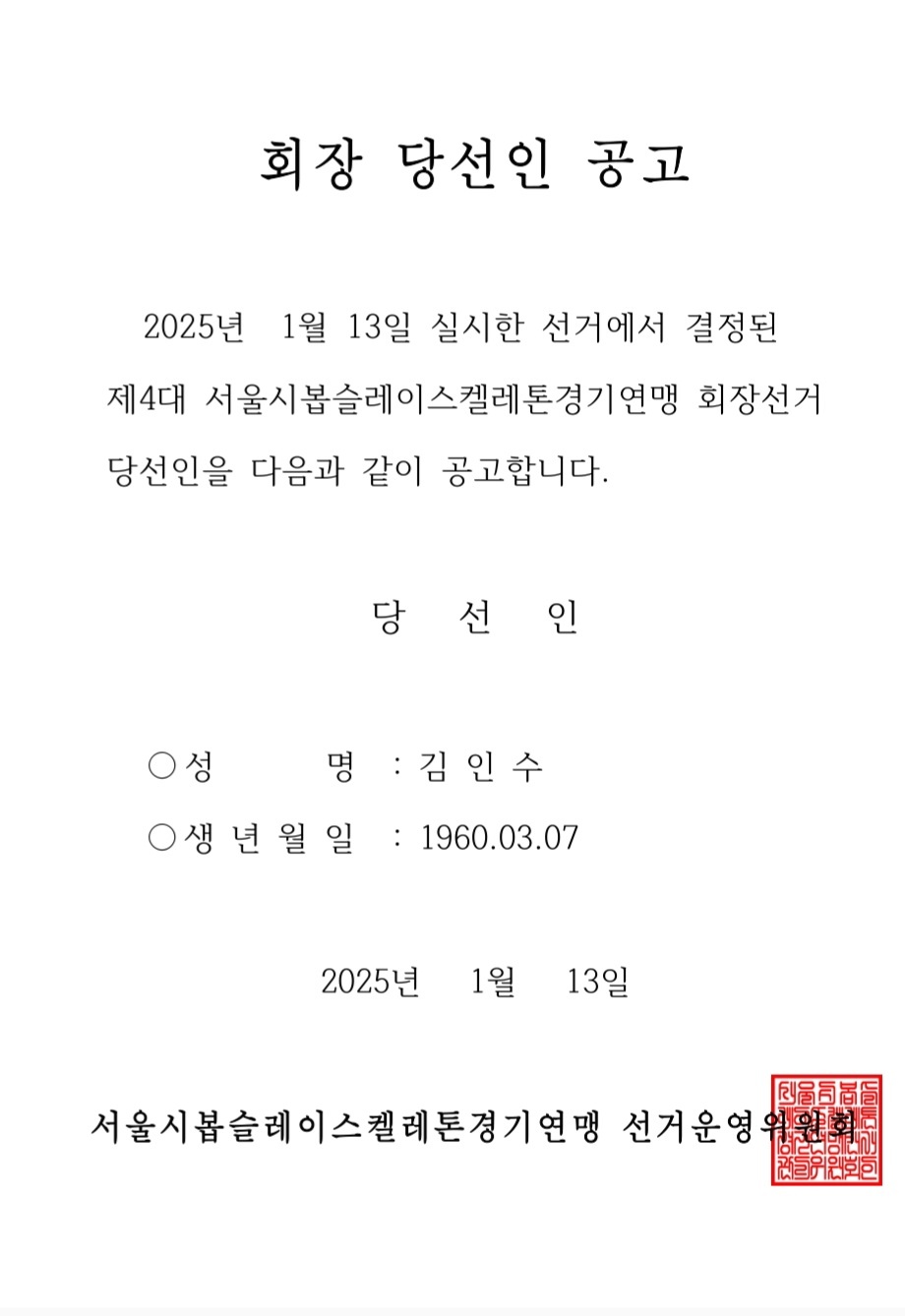 제4대 서울시봅슬레이스켈레톤경기연맹 회장선거 당선인 공고