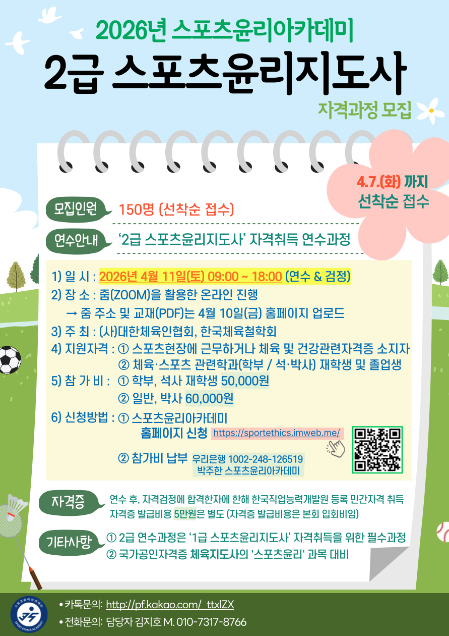 가. 연수과정 : ‘2급 스포츠윤리지도사’ 자격취득 연수과정 나. 일 시 : 2026년 4월 11일(토) 09:00~18:00 / 비대면 다. 장 소 : 줌(ZOOM)을 활용한 온라인 진행 라. 주 최 : 사단법인 대한체육인협회, 한국체육철학회 마. 지원자격 : ① 스포츠 현장에 근무하거나 체육 및 건강관련자격증 소지자 ② 체육․스포츠 관련학과 (학부/석․박사) 재학생 및 졸업생 바. 참 가 비 : 학부·석사 재학생-50,000원 / 일반·박사-60,000원 사. 신청방법 : ① 스포츠윤리아카데미 홈페이지 신청 https://sportethics,imweb.me/ ② 참가비 납부: 우리은행 1002-248-126519 (박주한 스포츠윤리아카데미)