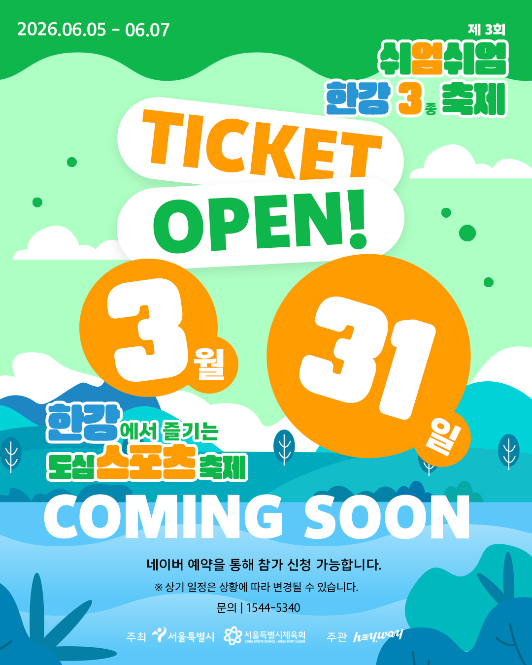 [제3회 쉬엄쉬엄 한강 3종 축제 접수 일정 안내] 3월 31일, 오후 2시 쉬엄쉬엄 한강 3종 축제 접수가 시작됩니다. 한강에서 펼쳐지는 달리기, 자전거, 수영 3종 경기! ㅇ 티켓오픈 주요정보 - 접수기간 : 3/31(화) 14:00 ~ 5/15(금) 23:59 - 예매 수량 : 1인 최대 4매 - 예매 플랫폼 : 네이버예약 - 문의전화 : 1544-5340